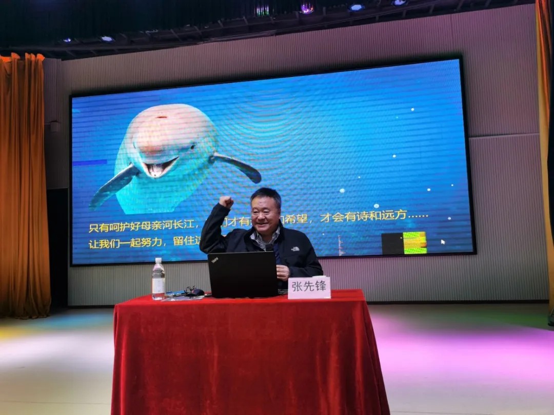 2025年12月29日下午,阳逻思源实验学校报告厅,一场关于长江江豚的“生态课堂”温暖开讲。中国科学院水生生物研究所研究员、武汉科学家科普团团员王丁以《守护长江精灵,共筑生态家园》为题,用40余年鲸类领域的科研坚守、震撼人心的案例和生动有趣的科普知识,带领七年级同学们走近长江“微笑天使”,开启了一场兼具科学深度与情感温度的生态保护之旅。 “大家知道吗?有一种长江特有的淡水鲸类,曾在江河中自在遨游,却因人类活动永远离开了我们。”讲座开篇,王丁老师的一句话便抓住了同学们的注意力。他缓缓讲述起白鱀豚的故事——这种被称为“长江女神”的珍稀动物,19